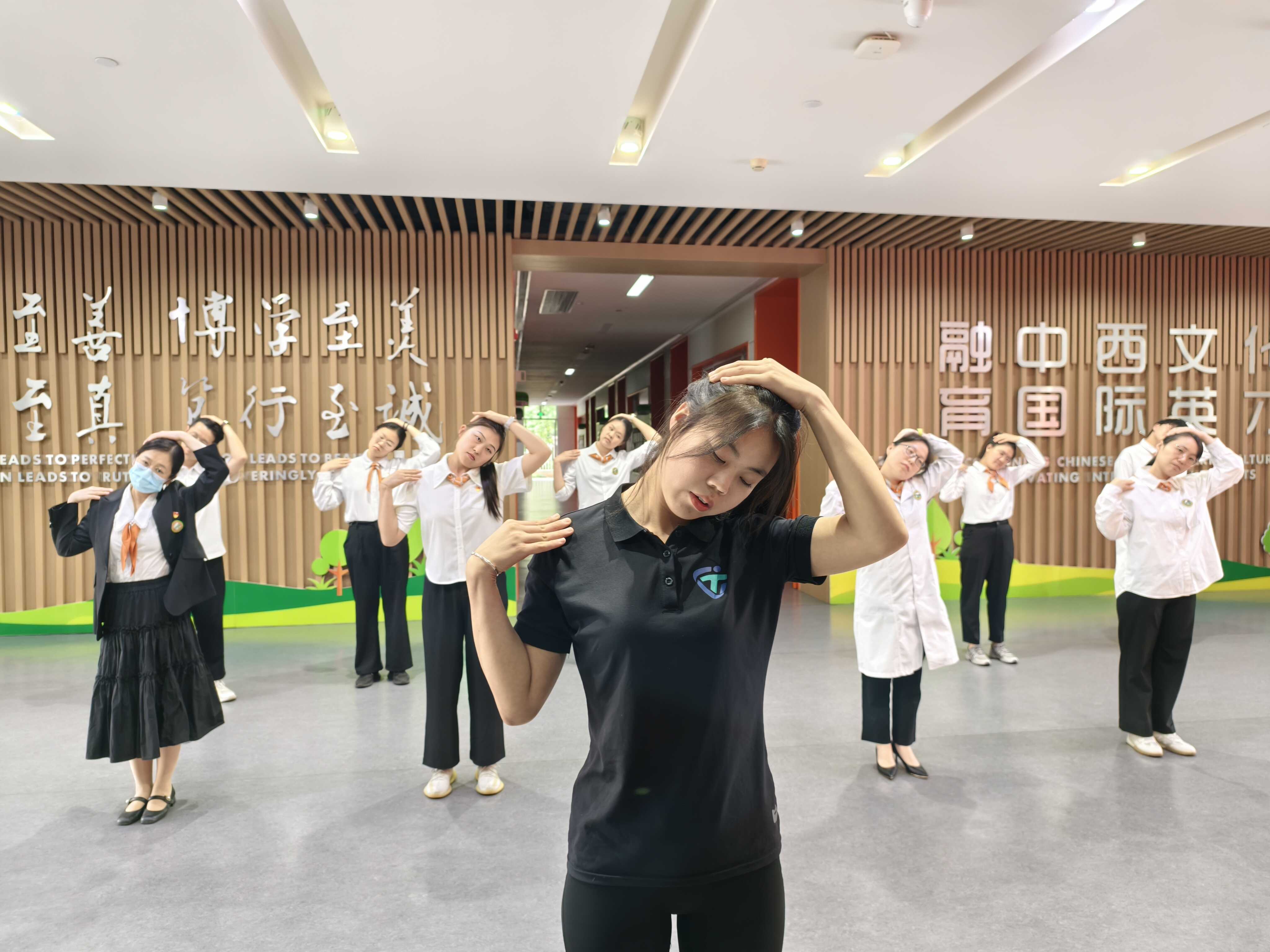 运动康复师江鑫走进天津生态城南开小学、天津外国语大学附属滨海外国语学校,针对教师长期伏案工作引发的颈肩劳损问题,现场教授“办公室颈肩操”。课程从热身到拉伸全程设计,逐项示范“头手相抗”“肩部推举”动作,强调动作连贯性与操作便捷性,帮助教师利用课间碎片时间缓解肌肉紧张,预防颈椎疾病。