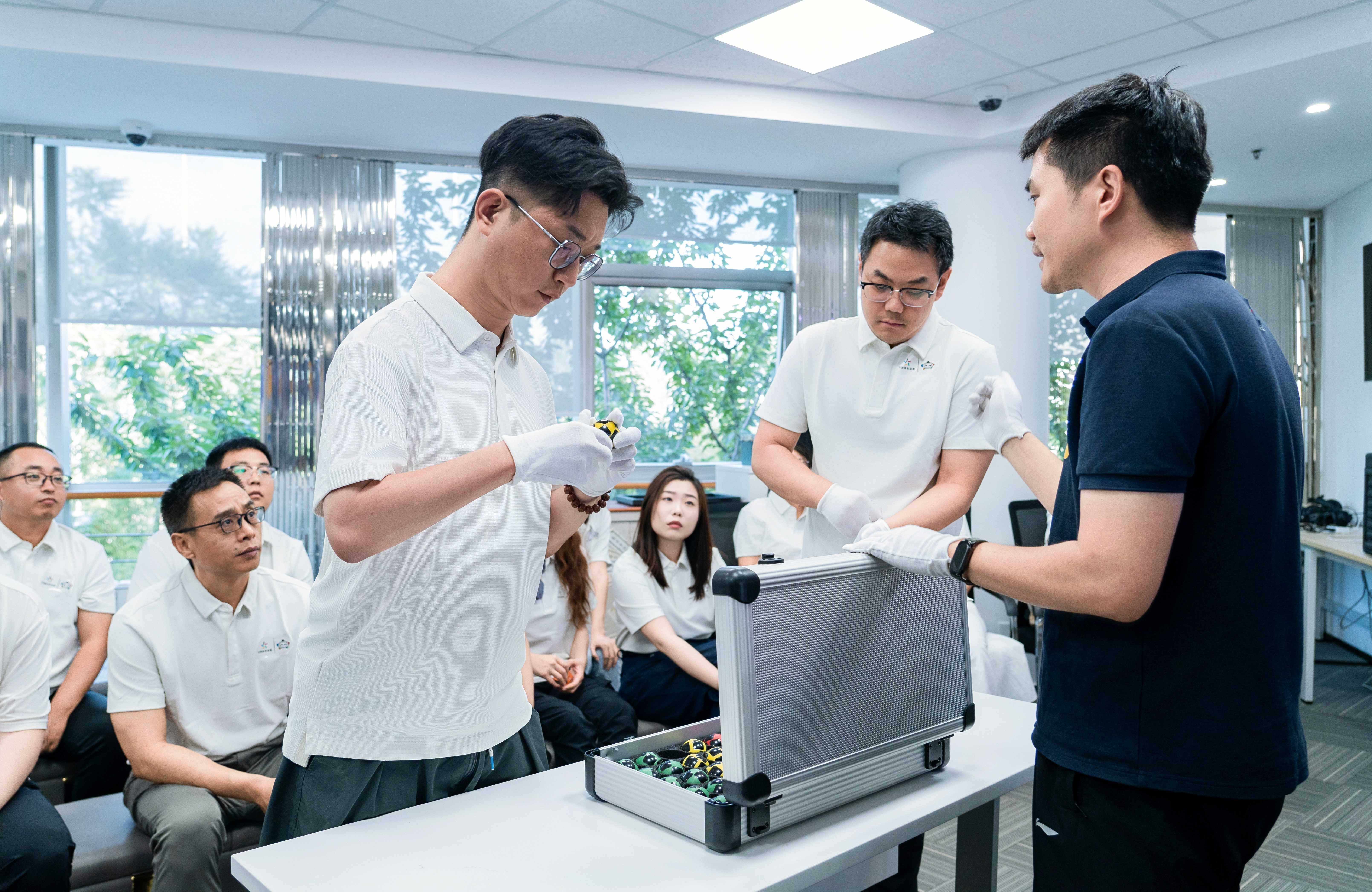 随后,见证团来到摇奖灾备场地。这里作为主摇奖现场的“坚实后盾”,一旦主场地遭遇险情、设备故障等突发状况,能即刻启用,保障当天的摇奖顺利进行。在这里,工作人员耐心解答了见证团提出的各种疑问,“试机球和正式摇奖球有啥不一样?”“为什么试机球上没有号码?”“为什么要设置摇奖灾备场地?”……在工作人员的指引下,见证团成员戴上手套,亲手触摸试机球,模拟公证员为摇奖机装球,深度体验了摇奖流程。